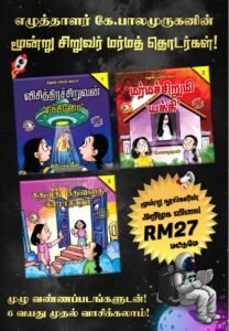 மேற்கண்ட விவரத்தின்படி மூன்று வண்ணத் தொடர் புத்தகங்களும் ரி.ம 27.00 மட்டுமே. மேலும் தபால் செலவு ரி.ம 6.00 ஆகும். முழுமையாக வண்ணச் சித்திரங்களுடன் உருவாகியுள்ள நூல்கள். வாசிக்கும் சிறுவர்களை உற்சாகப்படுத்துவதோடு வாசிப்பில் சிக்கலுள்ள பிள்ளைகள்கூட சரளமாக வாசிக்கும் அளவிற்கு ஆற்றலை மேம்படுத்தும். சிறுவர்கள், இளையோர்கள், பெரியவர்கள்கூட வாசிக்கலாம்.